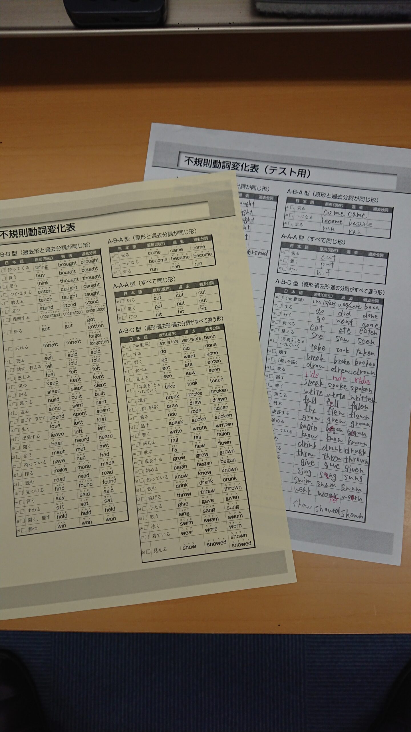 春期講習で英語を受講した中2生・中3生は、毎年恒例の不規則動詞動詞テストを毎回行いました。