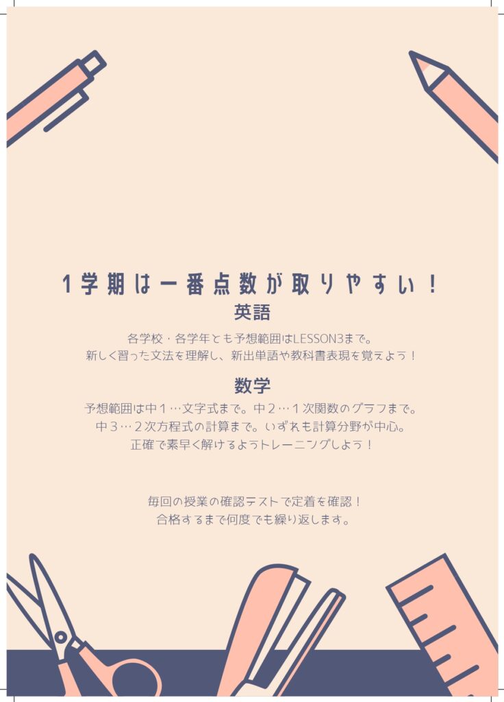 さて、1学期の期末テストまで1ヶ月あまりとなりました。