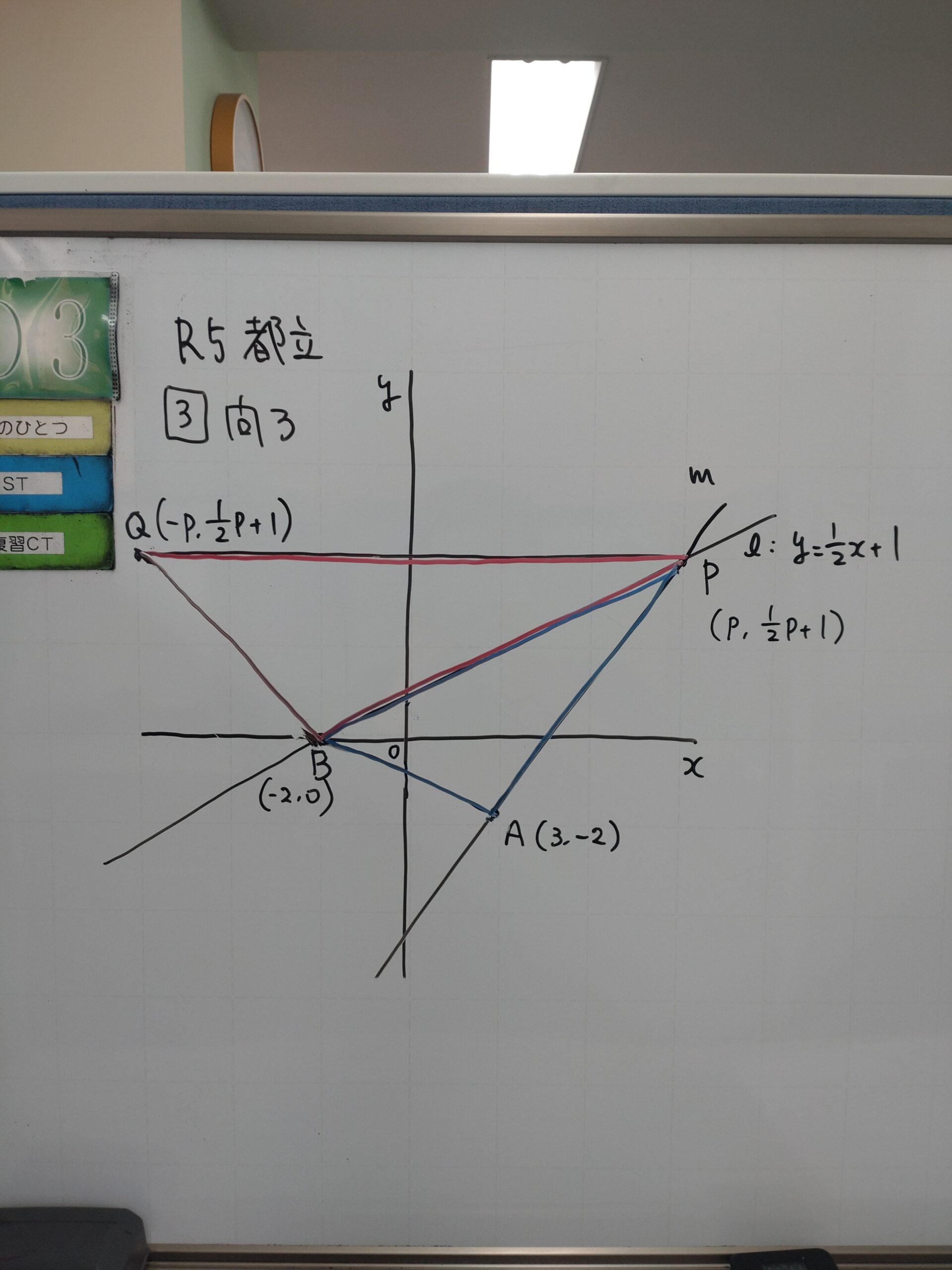 赤の三角形の面積が、青の三角形の面積の2倍になるような点Pを求めます。