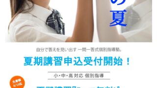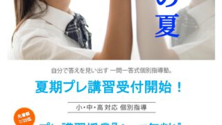 こんにちは。夏期講習の授業にも熱が入り、受験生は入試問題を想定して復習に励んでいます。受験生以外では1学期の復習からスタートしている生徒が多いですが、それもそろそろ終了し、2学期の予習へと入ろうとしています。近隣の公立中では9月の下旬にはも...
