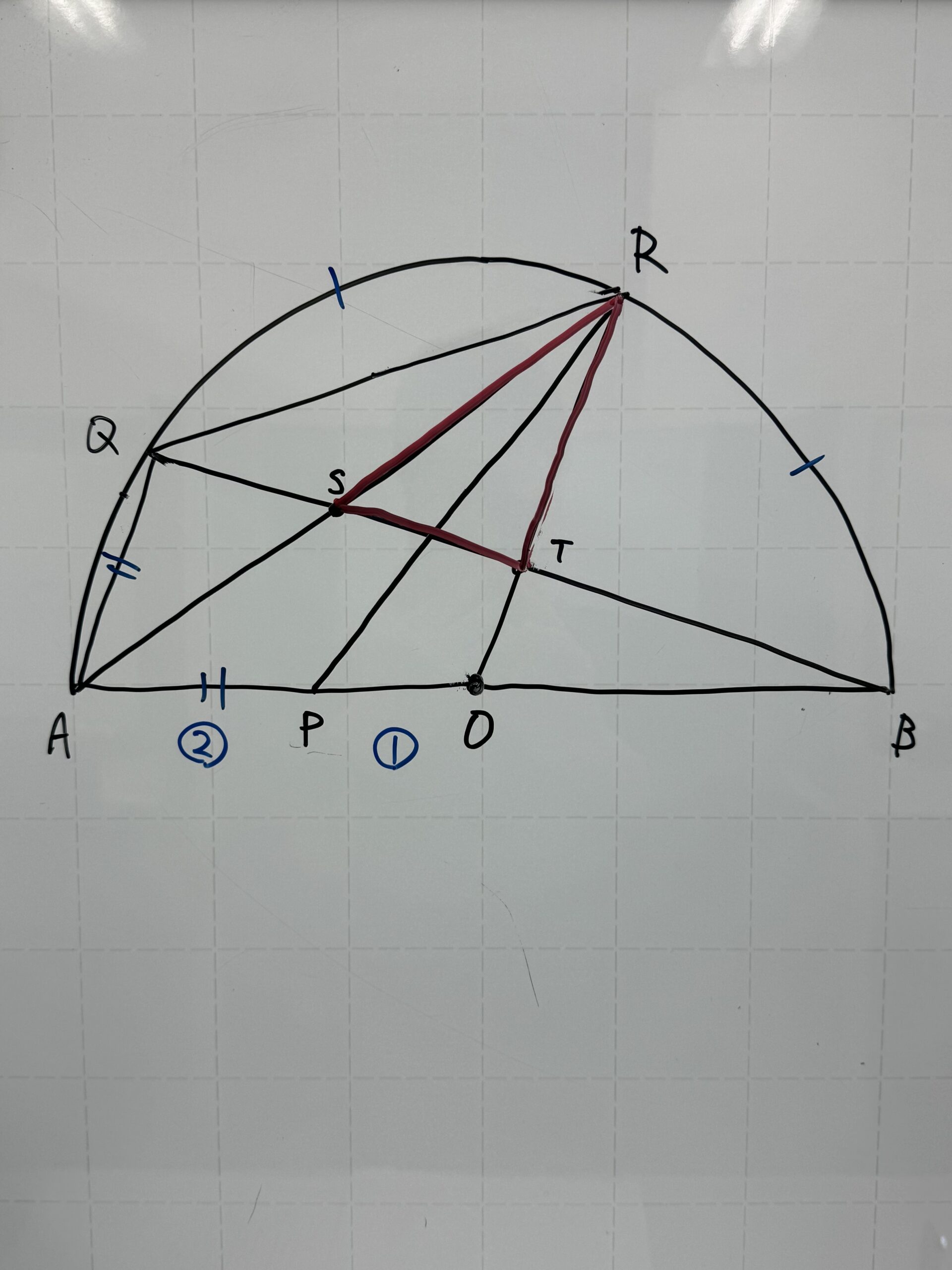 ②TO//QAとなり、△ABQに中点連結定理を使い、円の半径や1問前に証明した△APR≡△AQRを利用すると△AQS≡△RTS(赤い斜線部分)が導ける