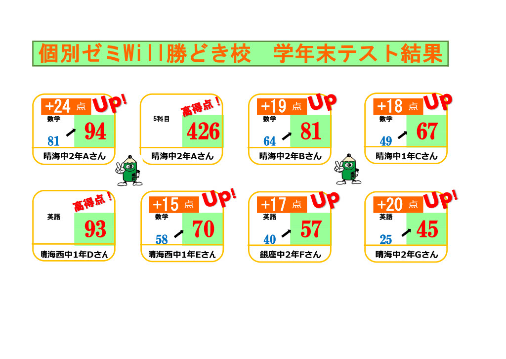 こんにちは。入試の総評などで遅れてしまいましたが、学年末テストで頑張った生徒たちの結果をご紹介します!