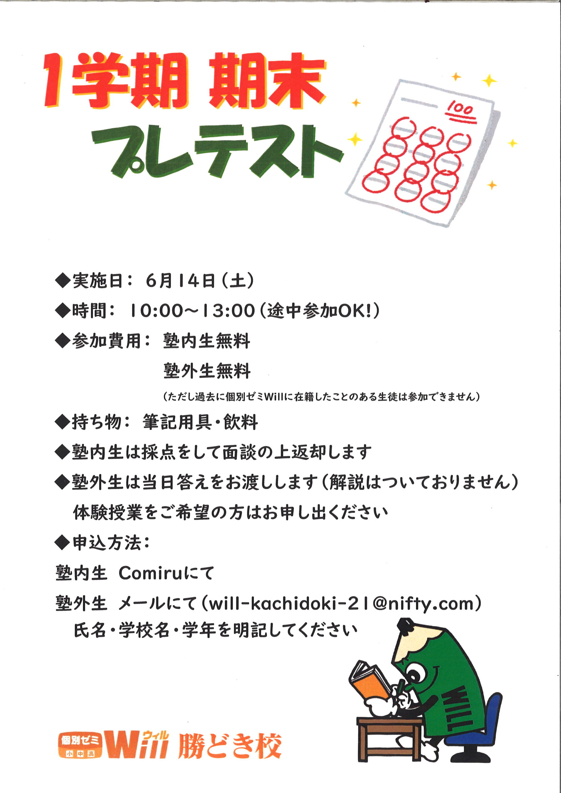 勝どき 期末プレテスト開催! 勝どき校 X Facebook はてブ LINE Pinterest コピー 2025.05.27 6/14(土)期末テストの直前ですがプレテストを行います。 塾内生に加えて塾外生の方も参加できます! 晴海中・晴海西中・銀座中・佃中生が対象となります。 ご参加お待ちしています!